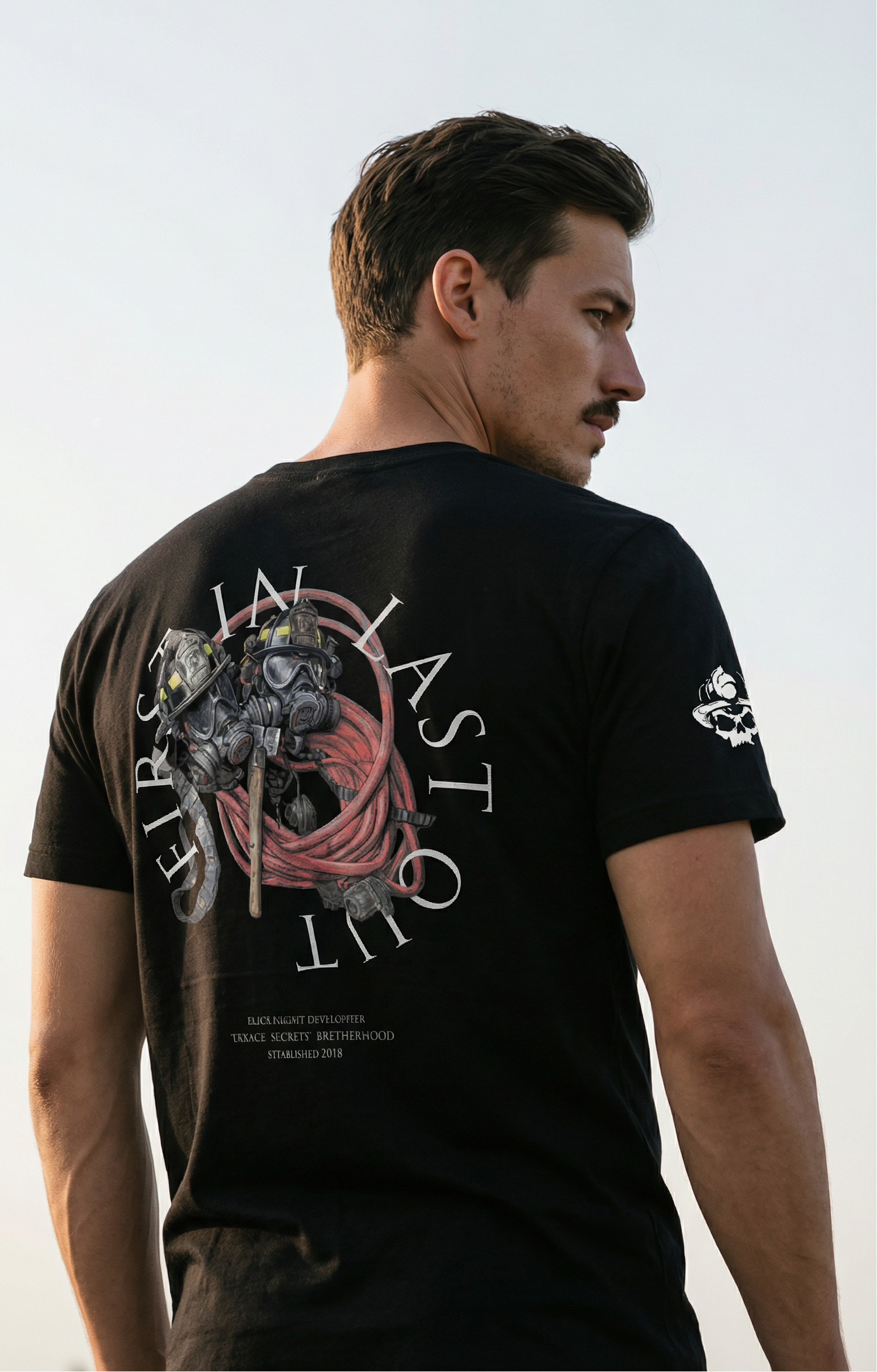 Presentamos la camiseta "First In, Last Out", diseñada e inspirada en los bomberos de Black Helmet, reconocidos por su valentía en primera línea. Esta camiseta rinde homenaje a quienes lo arriesgan todo, siendo los primeros en enfrentarse a las llamas y los últimos en marcharse, garantizando la seguridad de todos.
